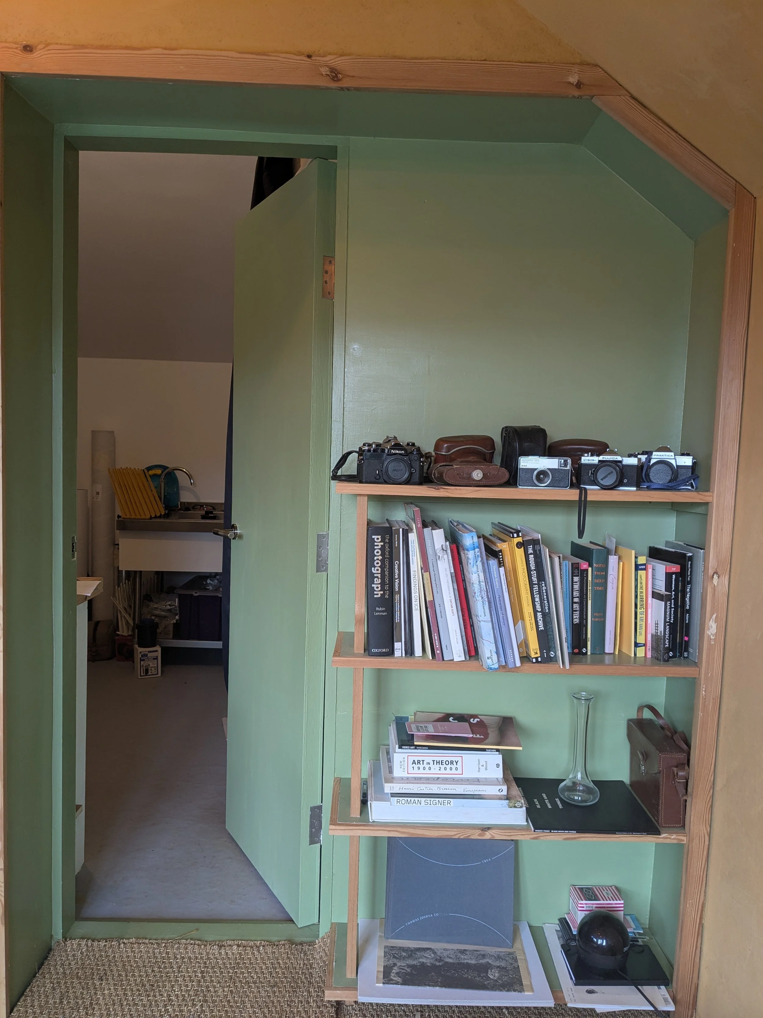 The workshop space overlooks the Campies hills in Scotland, and houses a photographic darkoom with four enlargers for running creative education courses around analogue processes. There is a seating area at the front, a space for creative discussion and reflection.